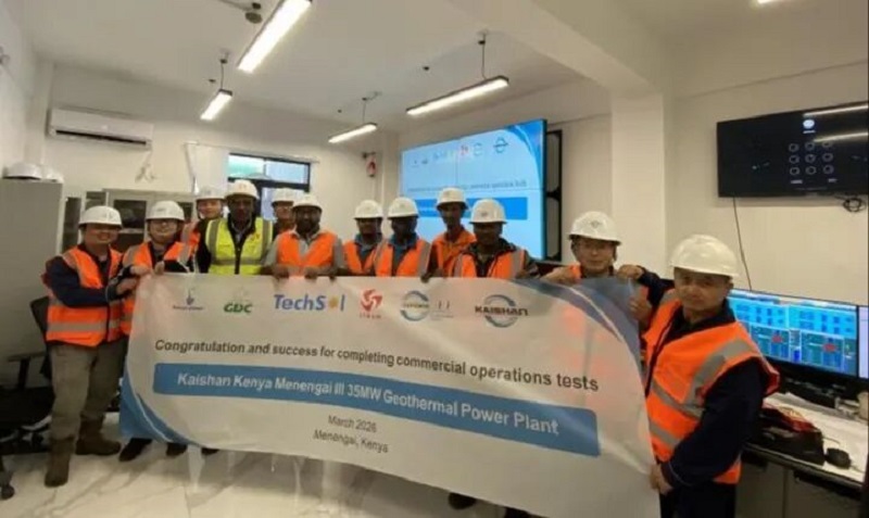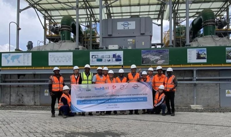 3月5日,yl23455永利官网集团股份有限公司在肯尼亚Menengai地热区全资拥有并建设的第一座地热电站(KK01——Kaishan Kenya 01电站)顺利完成了从2月2日开始的为期30天稳定性运行测试,至此,该电站全部的独立第三方见证测试均已完成,明天,独立工程师将颁布证书并通知肯尼亚国家电网公司KPLC,宣告这座电站实现商业运行(COD)。